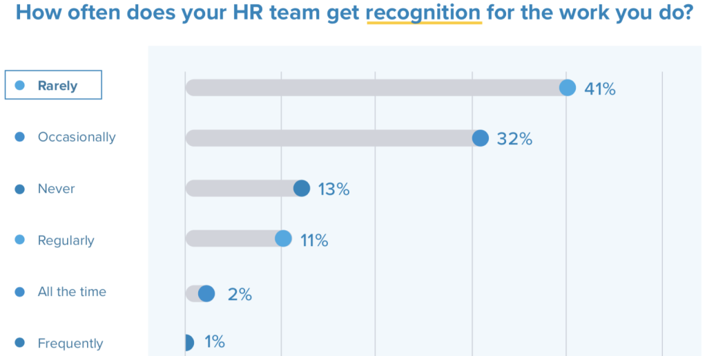 بر اساس این پژوهش، کمتر از دو نفر از هر پنج متخصص منابع انسانی میگویند که بهندرت بابت کاری که انجام میدهند، هرگونه قدردانی یا بهرسمیتشناسی دریافت میکنند. ۳۲٪ دیگر تنها گاهی اوقات مورد قدردانی قرار میگیرند و ۱۳٪ نیز میگویند که هرگز هیچگونه قدردانیای دریافت نمیکنند.