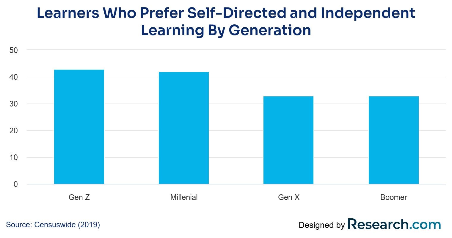 نظرسنجی انجام شده توسط Censuswide (گزارش یادگیری محل کار 2019) نشان میدهد که Gen Z و Millennials نسبت به همتایان Gen X و Boomer خود تمایل بیشتری نسبت به یادگیری خودراهبری و مستقل نشان میدهند.