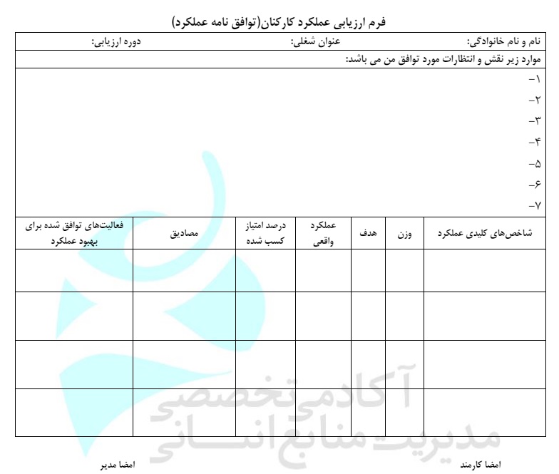 نتیجه این توافق در فرمهایی موسوم به فرم توافقنامه عملکردی ثبت میشود که شما میتوانید جهت آشنایی با آن، یک نمونه از آن را از لینک زیر دانلود نمایید.