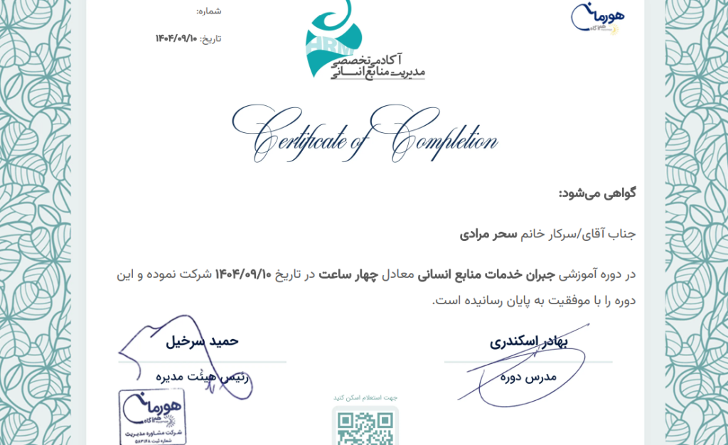 - گواهینامههای صادر شده، در سایت آکادمی تخصصی مدیریت منابع انسانی قابل استعلام و ردیابیست.