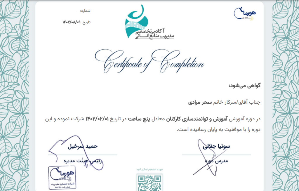 گواهینامه دوره آموزش و توانمندسازی کارکنان